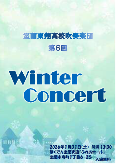 1月31日(土)、ほくでん室蘭支店「ふれあホール」にて、吹奏楽局のウィンターコンサートがあります。皆様のご来場を心よりお待ちしております。なお、駐車するスペースは少ないため、公共交通機関等をご利用ください。
