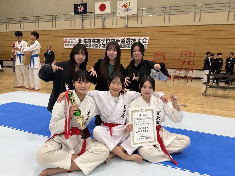 1/21(水)~1/23(金)に北海道立北見体育センターにて開催された、第43回北海道高等学校空手道選抜大会に本校空手道部の選手が出場しました。個人組手ではなかなか勝つことができませんでしたが、女子団体組手3人制では「優勝」し、部の目標としていた「全国大会出場」を果たすことができました。全国大会は3/23(日)~3/26(木)に長野県松本市で行われます。全国大会での1勝を目指し練習に励んでいきたいと思います。