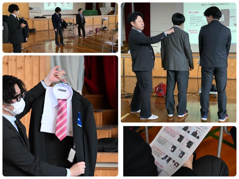3年次男子を対象に、進学・就職に向けた「スーツ着こなし講座」を実施しました。洋服の青山MORUE中島店の西店長様と寳田副店長様をお招きし、スーツの選び方や色合わせなどを実践的に学びました。