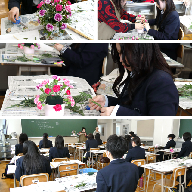 1月21(水)・23(金)日に選択授業「フードデザイン」において、ガーデンハウスNAKAMURAから講師を招いて『フラワーアレンジメント講習会』を行いました。テーブル中央に飾る「ドーム」型のお花になるように配色やバランスを考えながら仕上げました。
