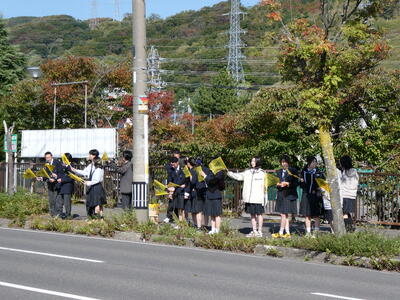 10月15日(水)本校前の道路において、生徒32名が交通安全に対する意識の高揚を図るため、旗の波運動に参加し、交通ルールの大切さを呼びかけました。